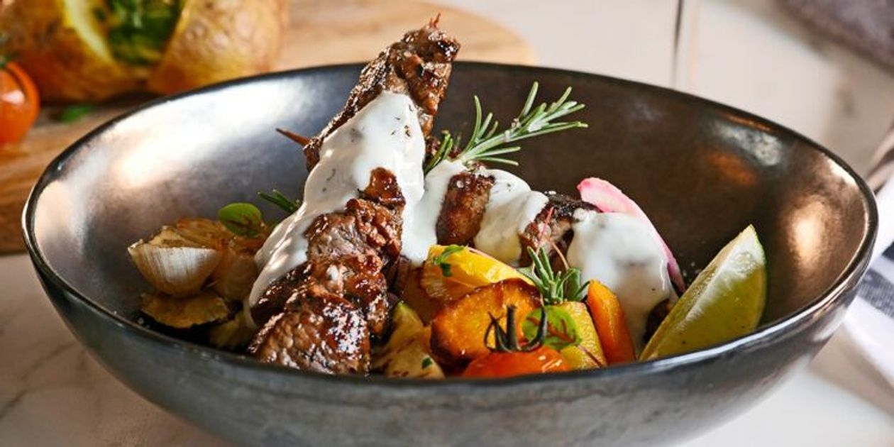 Salade chaude d’automne aux brochettes d’agneau et la Vinaigrette Yaourt