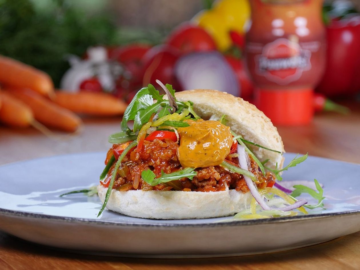 De Sloppy Joe: een pittige tomatensaus met rundsgehakt, groenten en kruiden geserveerd tussen een zacht hamburgerbroodje. Typisch Amerikaanse comfort food om duimen en vingers van af te likken.