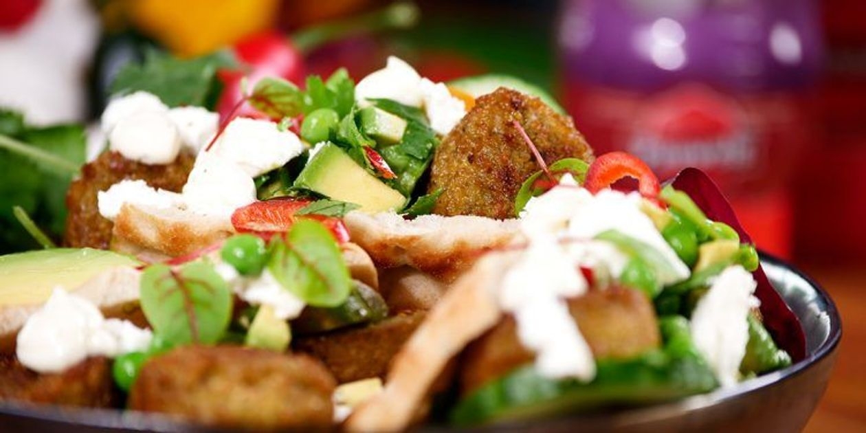 Voor deze variant op de klassieke pita snack gingen we de vegetarische toer op met falafel op basis van kikkererwten en geitenkaas, aangevuld met frisse smaken van avocado, komkommer en limoen. Afwerken doen we met een toefje looksaus van Pauwels. Smakelijk!