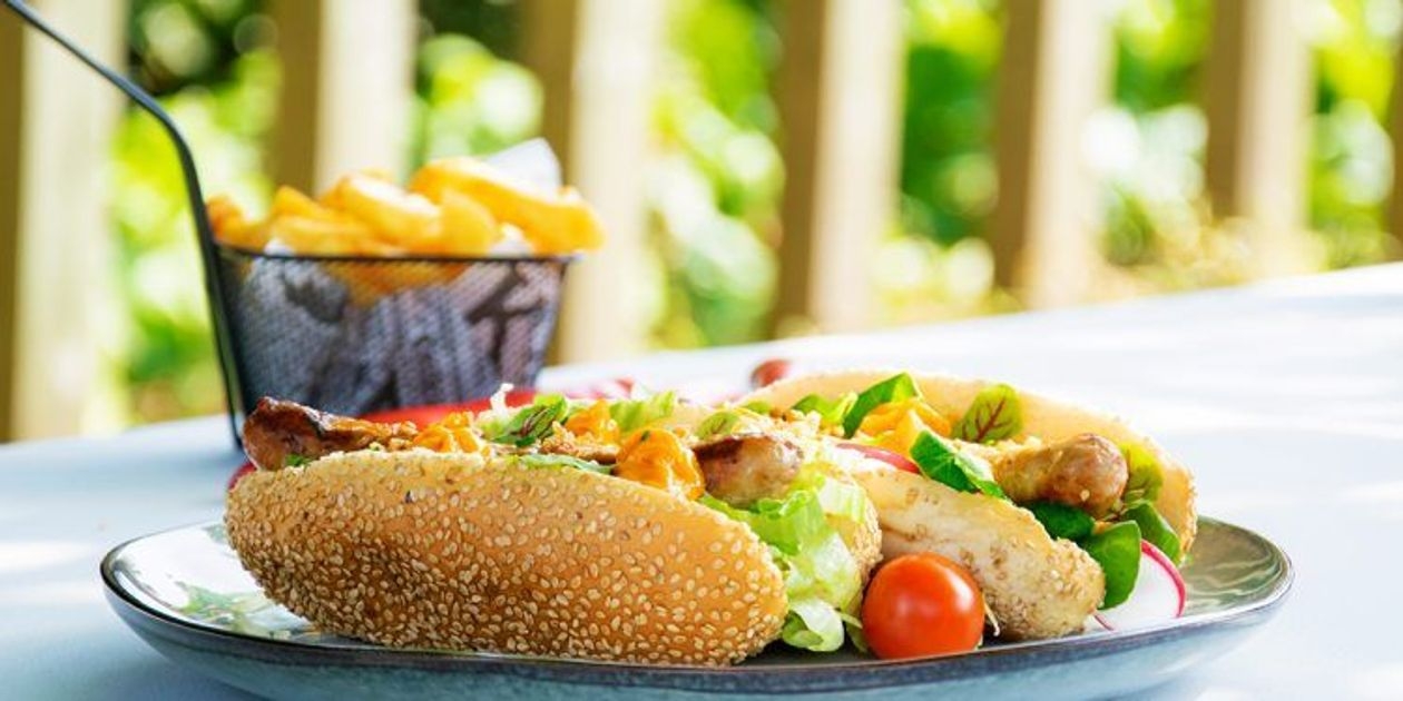 Geen traditionele hotdog, maar wél een pittig broodje merguez met krokante uitjes en onze Hot Mammouth met spicy chili. Een snelle en heerlijke snack.